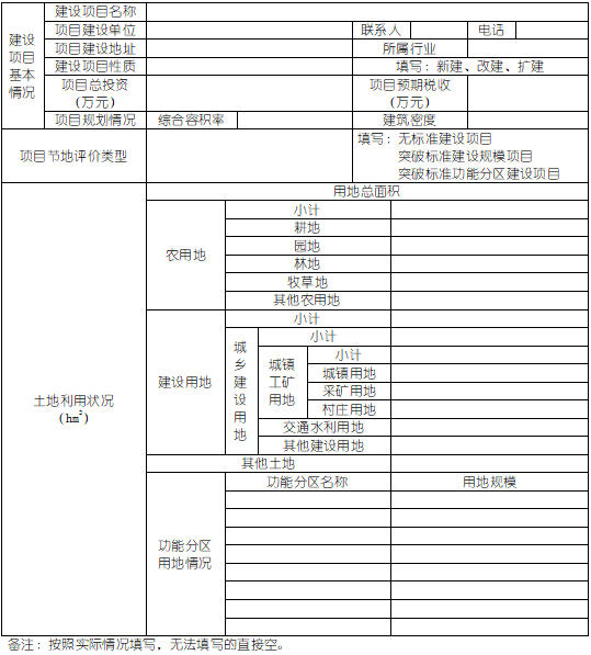 在申報建設用地之前,用地單位應詳細了解自身建設項目所在行業(yè)的土地使用標準和建設用地標準編制和發(fā)布情況;對于本行業(yè)既無(wú)土地使用標準又無(wú)建設標準的建設項目, 應自我認定為節地評價(jià)項目。