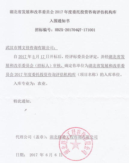 熱烈祝賀武漢市博文佳咨詢(xún)有限公司入圍湖北省發(fā)展和改革委員會(huì )2017年度委托投資咨詢(xún)評估機構庫