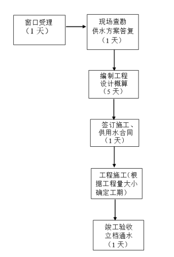 供水報裝業(yè)務(wù)辦理流程:用戶(hù)申請、提交資料→勘察設計→圖紙審查→工程預算編制→簽訂施工合同→工程施工→工程驗收→通水。