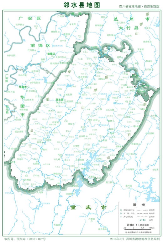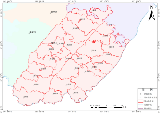 2.1.6資源特征(1)生物資源 江河、塘庫有鯉科、鮑科、鯰科、合鰓科等魚(yú)類(lèi)20余種,盛產(chǎn)鰱魚(yú)、草魚(yú)、鯉魚(yú)。主要野生動(dòng)物有47科,約150種,有豹、大靈貓、水獺、雕號鳥(niǎo)、雀鷹、蒼鷹、雉雞等珍貴動(dòng)物;主要野生植物有78科,約500余種,有馬尾松、銀杏、三尖杉、紅豆杉、潤楠等珍貴植物,有玉蘭、海桐、石榴等觀(guān)賞植物,有牛藤、荊芥、血藤、防風(fēng)、接骨木、一枝箭、桅子等藥用植物。 (2)礦藏資源 境內地質(zhì)構造復雜。礦藏資源較為豐富,已探明或已發(fā)現的礦藏有27種。有鋼鐵基本金屬礦的菱鐵礦、銳鈦礦;稀有金屬礦鋰、鈹;分散元互不礦鎵、鍺;冶金輔助原料礦耐火粘土、硅石、石灰巖、白云巖;化工原料礦磷、硫鐵礦、鹵水;建筑材料礦輝綠巖、玄武巖、高嶺土、石膏、石英;燃料礦煤、天然氣、油頁(yè)巖。二疊紀龍潭煤系和三迭紀須家河煤系原煤蘊藏量3.44億噸。龍潭煤系煤層達2.5米,是華鎣山煤田的重要產(chǎn)區。菱鐵礦地質(zhì)儲量3343.5萬(wàn)噸。礦石品位35-42.5%;鋁土礦含二氧化鋁38-44%,地質(zhì)儲量1190萬(wàn)噸;石膏地質(zhì)儲量2877.5萬(wàn)噸,硫鐵礦廣泛分布于華鎣山,蘊藏量豐富。天然氣儲存于三個(gè)背斜、兩個(gè)向斜中,是川東氣田的重要采區。 (3)土地資源 全縣土地類(lèi)型多、耕地比重較小、利用不夠充分、潛力較大。土壤類(lèi)型有黃壤土類(lèi)、紫色土類(lèi)、沖積土類(lèi)、水稻土類(lèi)。黃壤土類(lèi)分布于海拔500米以上的低山區,風(fēng)化度較深,膠體品質(zhì)差,重壤至粘土,施磷效果好,宜種度廣、占耕地面積的8.52%;紫色土分布于丘陵、平壩或山地,富含鉀、磷、鎂、錳元素,母質(zhì)風(fēng)化淺,肥力高,占耕地面積的39.9%;沖積土分布于溪河沿岸階地上,土質(zhì)肥沃,耕作方便,占耕地面積的0.5%;水稻土經(jīng)長(cháng)期水耕而成,占耕地面積的51.08%。 (4)旅游資源 鄰水縣歷史悠久,山水相間,旅游資源較為豐富。自然景觀(guān)方面,有以寶鼎為主體的華鎣山佛教圣地,有集峰叢、森林、積雪、云海為一體的華鎣山石林,有碧波萬(wàn)頃、島嶼縈回的“千島洪湖”,有巨壁摩天、曲折幽深的御臨河小三峽,有高山夾岸霧氣縈縈的小南海溫泉,有中國八大礦泉水之一華鎣山礦泉,有氣勢磅礴白練飛漱的望月瀑布群,有蒼翠欲滴空氣清新的“川東竹?!?,有避暑勝地羅家洞森林公園,有“生物活化石”倒須溝桫欏林,有撲朔迷離景物薈萃的九峰溶洞群;有溝壑縱橫,峽高谷深的龍須溝風(fēng)景區,有以明清古民居建筑為特色的湯巴丘民俗自然風(fēng)景區。人文景觀(guān)方面,有書(shū)巖石刻、靈寶山石刻、黃陵石刻、無(wú)糧寺摩崖造像、千佛崖摩崖造像、塘灣山崖墓、石廟寨崖墓、銀鼎山八角樓等等。 2.2社會(huì )經(jīng)濟概況2.2.1行政區劃根據《四川省人民政府關(guān)于同意廣安市調整部分鄉鎮行政區劃的批復》(川府民政〔2019〕16號)、《廣安市人民政府關(guān)于同意鄰水縣調整部分鄉鎮行政區劃的批復》,鄰水縣現轄25鎮(鼎屏、九龍、豐禾、柑子、城北、城南、合流、壇同、高灘、幺灘、袁市、石永、興仁、王家、八耳、觀(guān)音橋、牟家、三古、石滓、兩河、太和、椿木、梁板、復盛、黎家)。鄰水縣行政區劃圖見(jiàn)圖2-3。