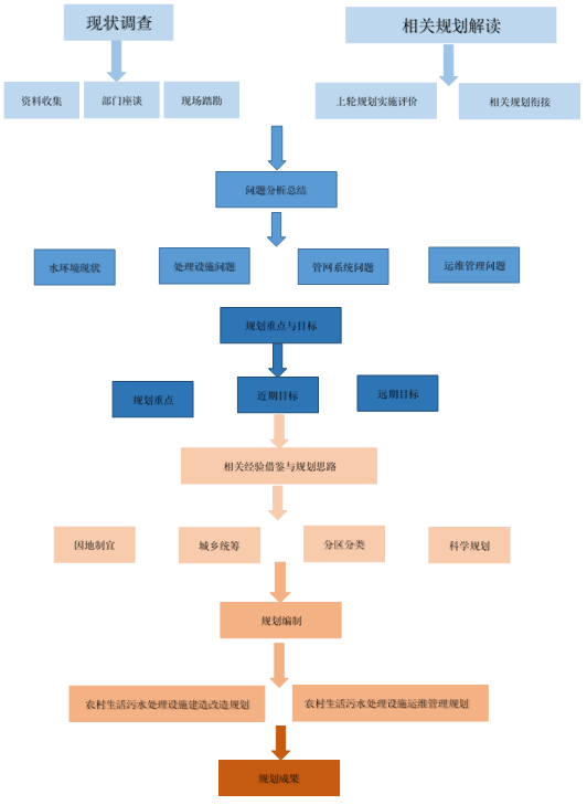 圖1-1技術(shù)路線(xiàn)圖 1.7規劃范圍規劃范圍為廣安市鄰水縣各鎮所對應行政村,具體行政村名單如表1-1所示。 1.8規劃年限規劃基準年為2019年,中期規劃至2022年,遠期規劃到2025年。 1.9規劃目標總體目標:規劃期末,鄰水縣農村生活污水治理水平不斷提升,農村人居環(huán)境質(zhì)量顯著(zhù)改善。 具體指標:2020年、2021年、2022年鄰水縣農村生活污水得到有效治理的行政村比例分別達到50%、60%、70%。到2025年,鄰水縣農村生活污水得到有效治理的行政村比例達到75%以上,農村人居環(huán)境質(zhì)量明顯提升。