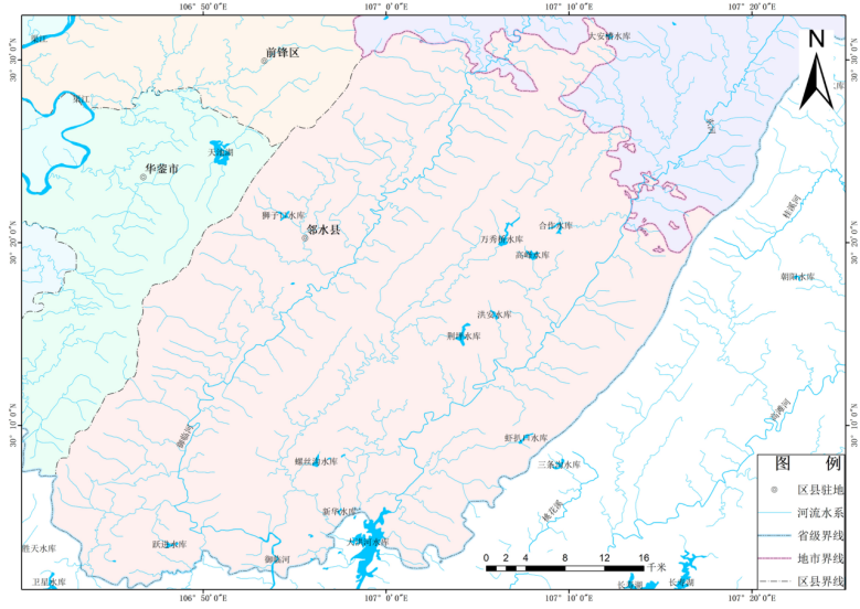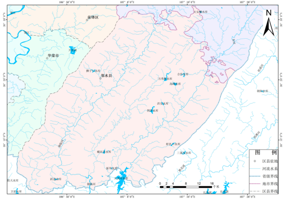 圖2-1鄰水縣地理位置 2.1.2地質(zhì)地貌鄰水縣屬川東褶皺平行嶺谷低山丘陵區,境內華鎣山、銅鑼山、明月山由西向東平行展布,大洪河、御臨河蜿蜒其間,形成“三山兩槽”的獨特地貌,深丘、淺丘、臺地、平壩兼而有之。東槽地勢平坦開(kāi)闊,適于發(fā)展農業(yè)產(chǎn)業(yè),是現代農業(yè)發(fā)展主要區域;西槽地勢相對較窄,礦產(chǎn)資源豐富,是工業(yè)發(fā)展主要區域??h域內地勢為北高南低,地形以中低山和丘陵為主,海拔500米以上為山地,面積123萬(wàn)余畝,占全縣總面積42.59%;海拔500米以下為深丘、淺丘或臺地;面積129萬(wàn)余畝,占全縣總面積的44.73%;溪河沿岸有面積大小不等的水平階梯分布,平壩面積36萬(wàn)余畝,占總面積的12.68%。華鎣山、銅鑼?shí){、明月峽三個(gè)背斜均高于向斜平均高1000m,主峰高登山海拔1704m,是四川盆地底部最高峰,與山麓干壩子的高差為1400m。銅鑼?shí){、明月峽兩個(gè)背斜與向谷地的高差都在500m以上。境內最高點(diǎn)為華鎣山脈的高登山山峰,海拔為1704m,最低點(diǎn)為御臨河南端,海拔為185m。 2.1.3氣候條件境內屬亞熱帶濕潤季風(fēng)氣候,其主要特點(diǎn)是:“冬暖春早,夏長(cháng)秋短”、“冬春雪少寒潮頻,初夏悶熱多梅雨,盛夏伏旱有洪澇,秋季涼濕多綿雨”。秦巴山地的屏障作用,減輕了冷空氣的強度,縣內三條山脈平行展布,進(jìn)一步減弱了寒冷的程度。盆地高空為溫暖的西風(fēng)南支急流所控制,加強了冬暖的特性。加之境內地形復雜,維度較低,冬夜不長(cháng),云雨豐富,風(fēng)力微弱,輻射冷卻大為減弱,增溫、保溫的地形效應十分明顯,冬季較相同維度的長(cháng)江中下游暖和。多年平均氣溫16.9℃,1月平均氣溫6.1℃,極端最低氣溫3.8℃。夏季受東南季風(fēng)和西藏副熱帶大陸高壓合并控制,閉塞的地形不利透風(fēng),日間增溫迅速:夜間云層較厚,熱量難以逸散,水汽吸收的地面長(cháng)波返回地面,夜間氣溫降低較慢,以致出現連晴高溫天氣。7月平均氣溫27.3℃,極端高溫可達40.5℃。如太平洋高壓弱移時(shí)間提早,則雨季提前:如高壓勢特別強,則出現干旱。入春后南方溫暖氣流北上,升溫較快,穩定上升至10℃的平均初日為3月15日,比上海提前20天。北方寒流南下時(shí),大約7天左右有一次降雨降溫過(guò)程。秋季,因地形阻滯,冷暖空氣消長(cháng)不下,日照少,雨天多,平均氣溫略高于春季。多年日平均氣溫在5℃以上的持續期348天,在0℃以上的持續365天,霜日100天。年平均降水量1206.8mm,全年各季降水量分配不均,常年夏季平均降水量528.8mm,冬季平均降水量66.5mm,春季降水量302.5mm,秋季降水量309.1mm。 2.1.4水文(1)河流 鄰水縣河流屬長(cháng)江流域水系,境內河流眾多,主要河流御臨河、大洪河、白水河從東北入境,縱貫南北,流向西南匯入長(cháng)江。在眾多河流中,境內流域面積大于100km2的河流有5條,分別為御臨河、大洪河、白水河、小西河、橋壩河。具體情況見(jiàn)圖2-2和表2-1。