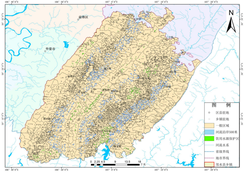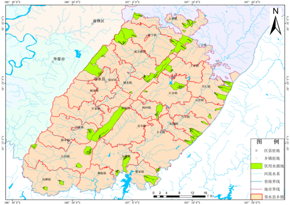 表2-16縣域城鎮等級結構表 第三章 現狀評價(jià)3.1水環(huán)境現狀鄰水縣河流屬長(cháng)江流域水系,境內地表水均屬于御臨河流域范圍。根據2019年12月13日采樣檢測數據分析(參考標準:《地表水環(huán)境質(zhì)量標準》(GB3838-2002);評價(jià)方法:《地表水資源質(zhì)量評價(jià)技術(shù)規程》(SL395-2007);御臨河幺灘、御臨河雙河口大橋、大洪河入境崗架大橋監測斷面均符合地表水Ⅲ類(lèi)水質(zhì)標準;省控監測點(diǎn)位大洪湖黎家鎮崔家巖村為地表水(湖庫)Ⅳ類(lèi)水質(zhì),總磷超標0.6倍。鄰水縣地下水類(lèi)型主要是重碳酸鈣鎂型,以重碳酸鹽為主,其次是硫酸鹽型或硫酸重碳酸鈣鈉型??h內地下水總硬度一般為13.7-336.5mg/L,平均為94.6mg/L,pH為在5.6-7.4之間,總硬度(以CaCO3計)均小于400mg/L,屬于中低性硬水。氨氮和亞硝酸鹽氮部分地區高于生活飲用水標準;大腸桿菌數在30-7380個(gè)/L,明顯高于生活飲用水標準,部分地方含碘量低??拷A鎣山、銅鑼山、明月山區的地下泉水水質(zhì)相對較好。 根據鄰水縣2019年12月13日城市集中飲用水源水質(zhì)監測結果,鄰水縣城市集中式飲用水源關(guān)門(mén)石水庫各項指標均符合《地表水環(huán)境質(zhì)量標準》(GB3838-2002)Ⅱ類(lèi)水質(zhì)標準;根據鄰水縣2019年10月21日第三季度鄉鎮飲用水源水質(zhì)檢測結果,鄰水縣18個(gè)地下水鄉鎮飲用水源各項檢測指標均滿(mǎn)足《地下水質(zhì)量標準》(GB/T14848-2017)Ⅲ類(lèi)水質(zhì)標準。地表水鄉鎮飲用水源中,有26個(gè)飲用水源滿(mǎn)足《地表水環(huán)境質(zhì)量標準》(GB3838-2002)Ⅲ類(lèi)水質(zhì)標準,其中高灘鎮堰家溝水庫為Ⅳ類(lèi)水質(zhì),COD超標0.35倍,地表水鄉鎮飲用水源達標率為96%。鄰水縣飲用水源地分布見(jiàn)圖3-1。