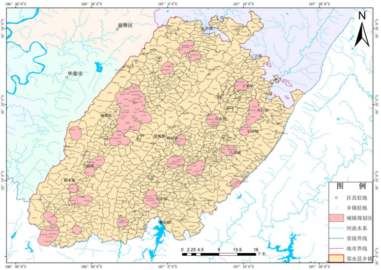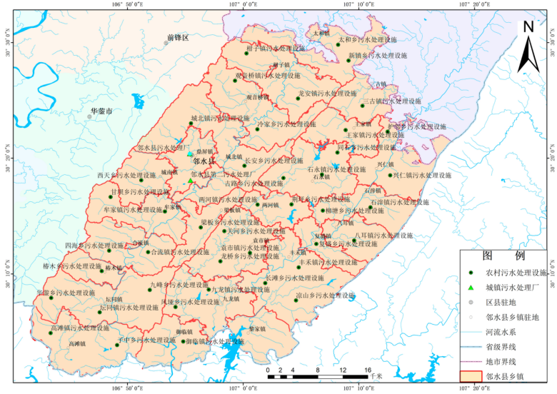 圖3-2鄰水縣污水處理設施范圍圖 表3-1鄰水縣各鎮生活污水處理現狀